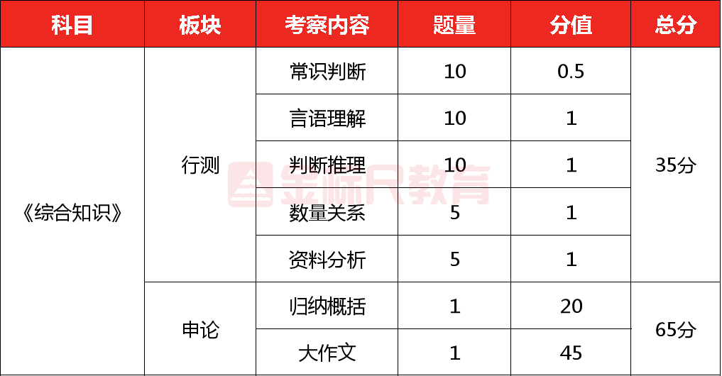 安徽定向选调历年来考察科目为《综合知识》,包括行政职业能力测验和申论两部分内容,重点测查用新思想指导分析和解决问题的能力,满分为100分。具体题型、题量参考如下: