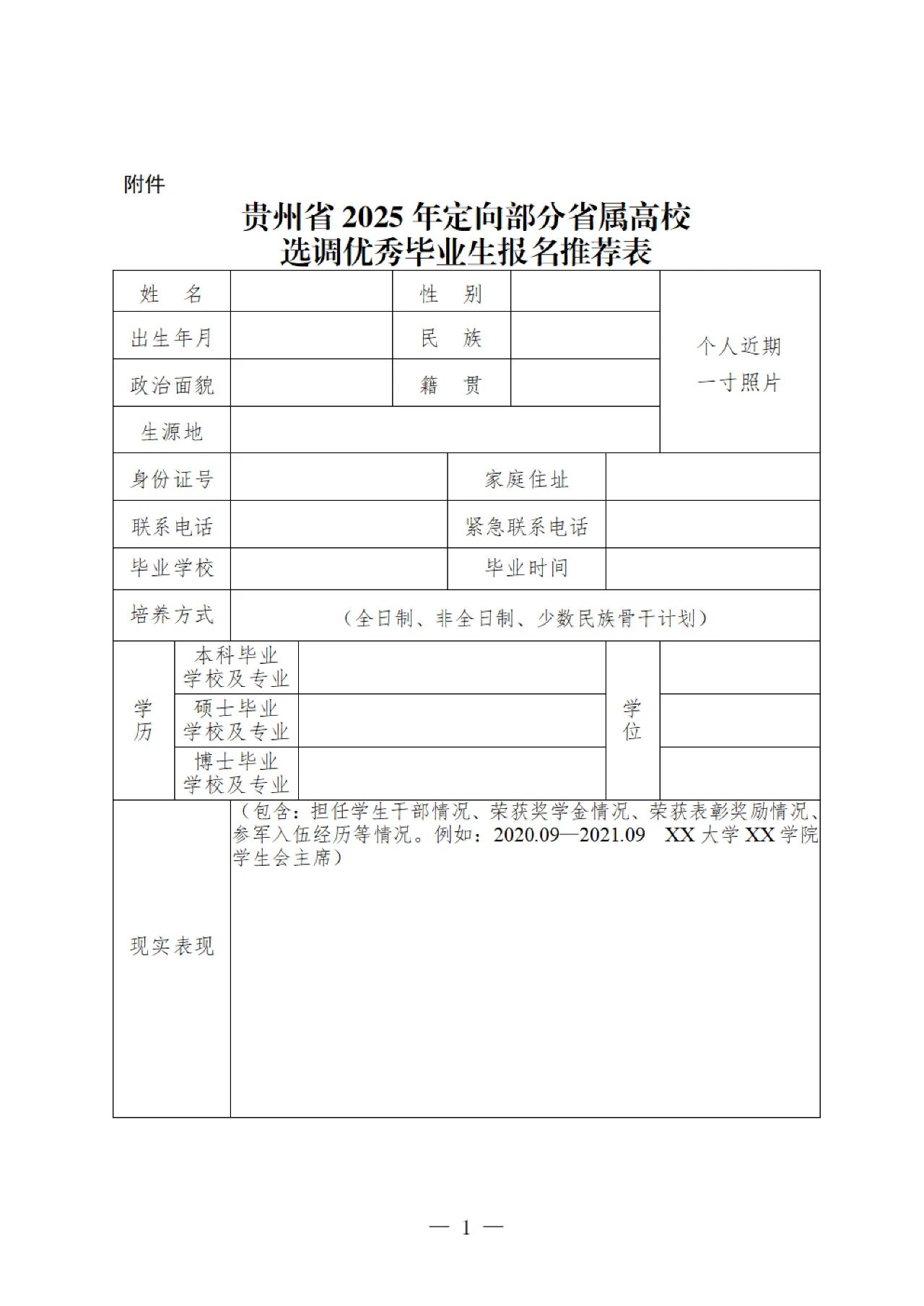 附件:贵州省2025年定向部分省属高校选调优秀毕业生报名推荐表