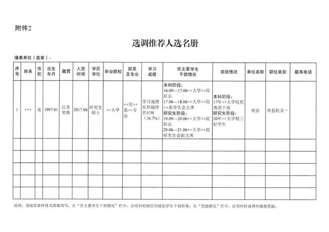 1﹒推荐报名。报考人员填写《选调推荐人选名册》,向所在院系党组织提出申请,高校党委组织部(学生处、就业指导中心)审核汇总,并报高校党委研究确定推荐名单。高校推荐不设名额限制。推荐名单须在学校就业信息网公示。具体职位及选调数量见附件。